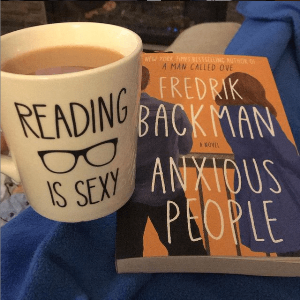 [ID: A mug of tea in a ‘Reading is Sexy’ mug with a blue blanket across the reader’s lap and the cover of Fredrik Backman’s novel Anxious People.]